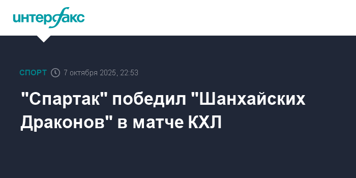 Москва. 7 октября. INTERFAX.RU - Хоккеисты московского "Спартака" со счетом 3:0 взяли верх над "Шанхайскими Драконами" в домашнем матче регулярного чемпионата КХЛ.