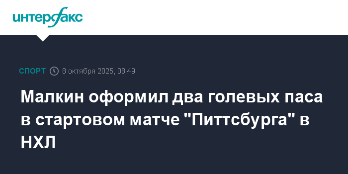 Москва. 8 октября. INTERFAX.RU - Российский нападающий "Питтсбурга" Евгений Малкин отметился двумя результативными передачами в стартовой встрече команды в регулярном чемпионате Национальной хоккейной лиги-2025/26 против "Рейнджерс".