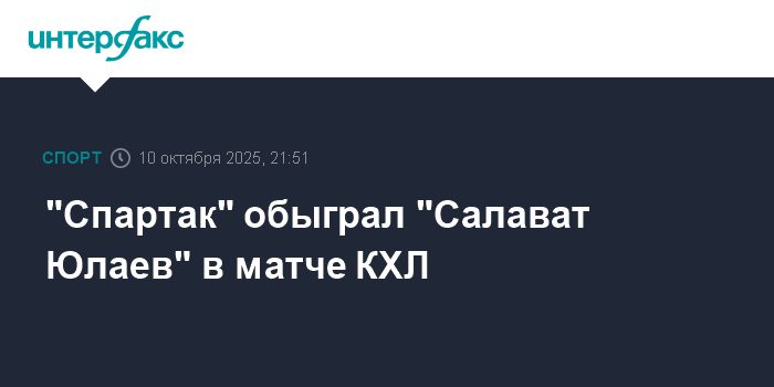 Москва. 10 октября. INTERFAX.RU - Московский "Спартак" со счетом 2:1 взял верх над уфимским "Салаватом Юлаевым" в домашнем матче регулярного чемпионата Континентальной хоккейной лиги.