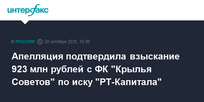 Апелляция подтвердила взыскание 923 млн рублей с ФК "Крылья Советов" по иску "РТ-Капитала"