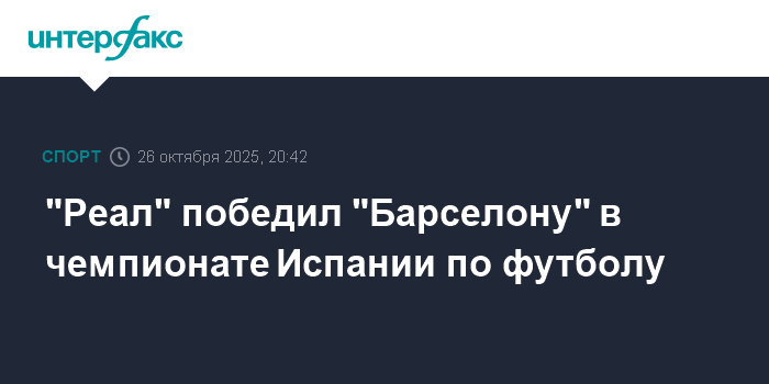 Москва. 26 октября. INTERFAX.RU - Футболисты "Реала" со счетом 2:1 взяли верх над "Барселоной" в домашнем матче 10-го тура чемпионата Испании.