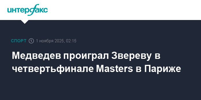 Москва. 1 ноября. INTERFAX.RU - Российский теннисист Даниил Медведев проиграл немцу Александру Звереву в матче 1/4 финала турнира категории Masters в Париже.