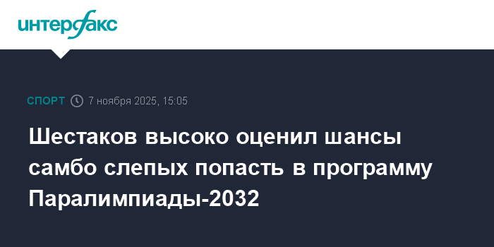 Москва. 7 ноября. INTERFAX.RU - Президент Международной федерации самбо (ФИАС) Василий Шестаков позитивно настроен относительно перспектив самбо слепых попасть в программу летних Паралимпийских игр-2032 в Брисбене (Австралия).