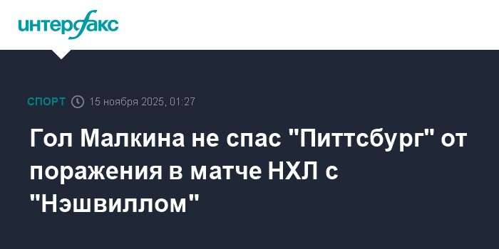 Москва. 15 ноября. INTERFAX.RU - "Питтсбург" со счетом 1:2 уступил "Нэшвиллу" в матче регулярного чемпионата Национальной хоккейной лиги.