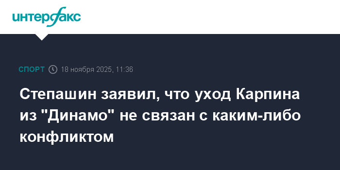 Москва. 18 ноября. INTERFAX.RU - Уход Валерия Карпина с поста главного тренера московского футбольного клуба "Динамо" не связан с какими-либо конфликтами в клубе. Об этом во вторник заявил во "Интерфаксу" член совета директоров, глава консультативного совета "Динамо" Сергей Степашин.