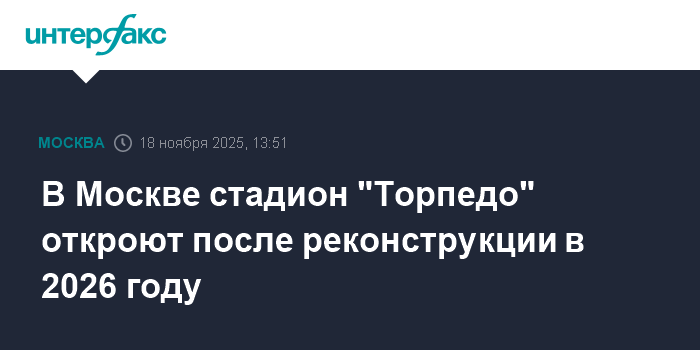 Москва. 18 ноября. INTERFAX.RU - В Москве реконструкцию стадиона "Торпедо" имени Эдуарда Стрельцова на Восточной улице завершат в 2026 году, сообщил журналистам мэр столицы Сергей Собянин.