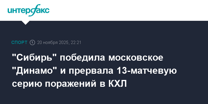 Москва. 20 ноября. INTERFAX.RU - Новосибирская "Сибирь" со счетом 4:3 взяла верх над московским "Динамо" в матче регулярного чемпионата Континентальной хоккейной лиги.