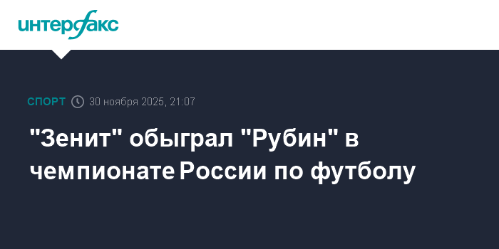Москва. 30 ноября. INTERFAX.RU - Футболисты петербургского "Зенита" со счетом 1:0 взяли верх над казанским "Рубином" в домашнем матче 17-го тура РПЛ.