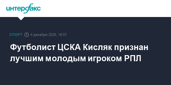 Москва. 4 декабря. INTERFAX.RU - Полузащитник ЦСКА и сборной России по футболу Матвей Кисляк стал лауреатом премии "Первая пятерка", вручаемой лучшему молодому игроку РПЛ. Об этом сообщает организатор премии - Детская футбольная лига имени Виктора Горлова.