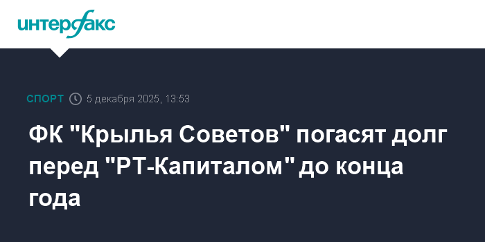 Москва. 5 декабря. INTERFAX.RU - Самарский футбольный клуб "Крылья Советов" планирует погасить долг перед ООО "РТ-Капитал" (входит в госкорпорацию "Ростех") до конца 2025 года, сообщил на "прямой линии" губернатор Самарской области Вячеслав Федорищев .