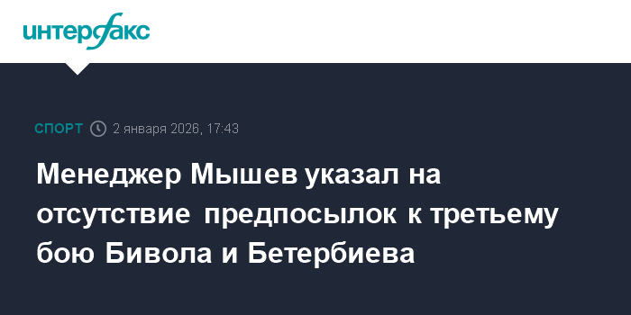 Москва. 2 января. INTERFAX.RU - Экс-чемпион WBC Youth, а ныне спортивный менеджер Владимир Мышев скептически высказался о потенциальном третьем поединке Дмитрия Бивола и Артура Бетербиева в России.