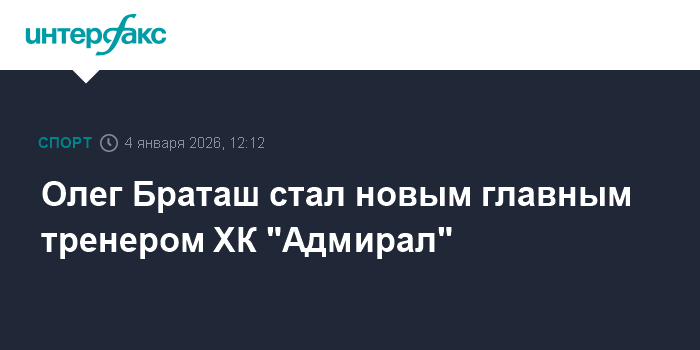 Москва. 4 января. INTERFAX.RU - Олег Браташ назначен главным тренером "Адмирала", сообщает пресс-служба владивостокского хоккейного клуба.