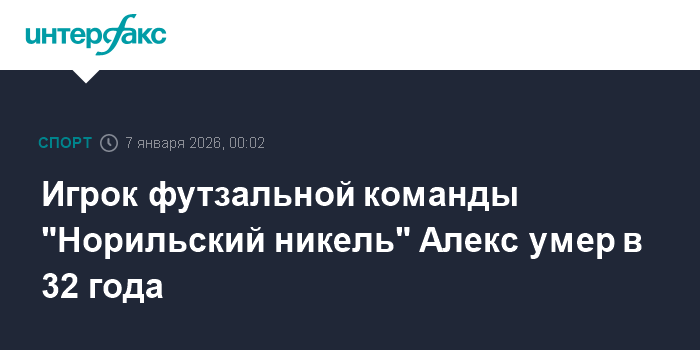 Москва. 7 января. INTERFAX.RU - Игрок команды "Нoрильский никель", выступающей в отечественной футзальной Суперлиге, Фелипе Алекс скончался в возрасте 32 лет. Об этом сообщает пресс-служба Суперлиги.