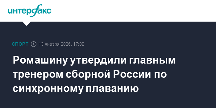 Москва. 13 января. INTERFAX.RU - Минспорт РФ утвердил Светлану Ромашину в должности главного тренера сборной России по синхронному плаванию. Об этом сообщает пресс-служба Федерации водных видов спорта России.
