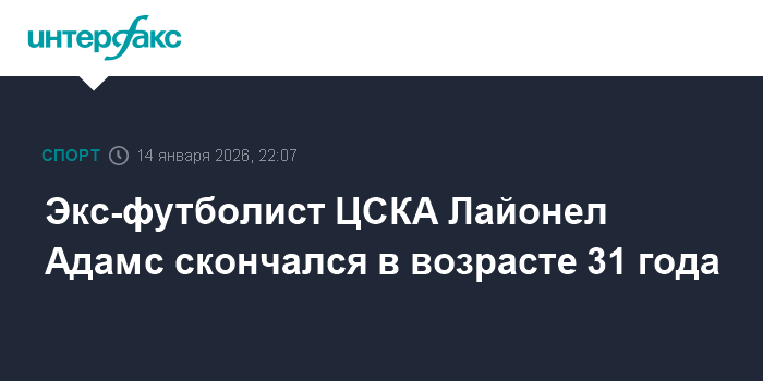 Москва. 14 января. INTERFAX.RU - Воспитанник ЦСКА Лайонел Адамс скончался на 32-м году жизни, сообщает пресс-служба московского футбольного клуба.