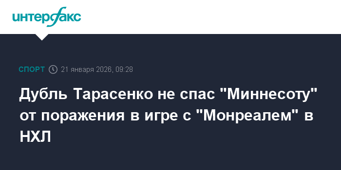 Москва. 21 января. INTERFAX.RU - "Миннесота" со счетом 3:4 уступила "Монреалю" в гостевом матче регулярного чемпионата Национальной хоккейной лиги.