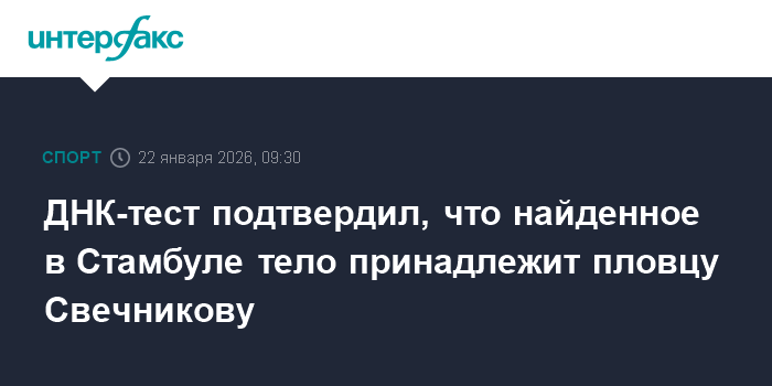 Москва. 22 января. INTERFAX.RU - Тело мужчины, обнаруженное в турецком Босфоре, принадлежит российскому пловцу Николаю Свечникову. Об этом сообщает "Матч ТВ", ссылаясь на матч спортсмена Галина Свечникова.