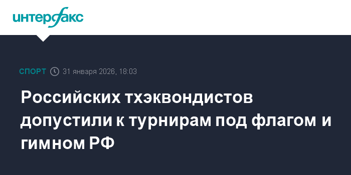 Москва. 31 января. INTERFAX.RU - Всемирная федерация тхэквондо (World Taekwondo) допустила россиян и белорусов к участию в международных соревнованиях с национальной символикой стран. Об этом сообщается на сайте организации.