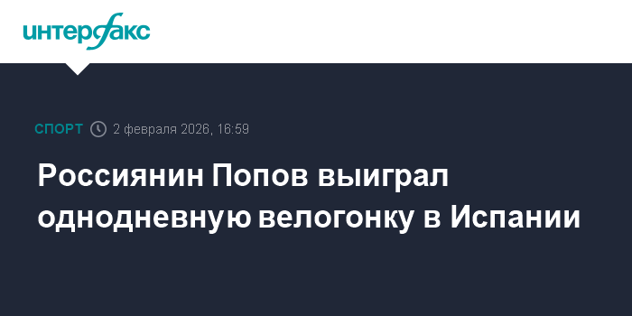 Москва. 2 февраля. INTERFAX.RU - Россиянин Марк Попов из испанской команды Baix Ebre Penya Ciclista одержал победу в однодневке Gran Premi d'Hivern de Morell, входящей в серию гонок Challenge Comarques Tarragona.