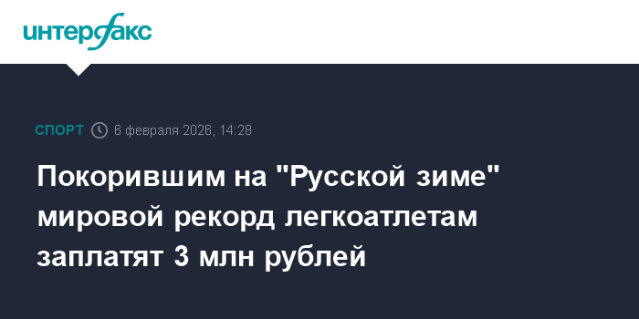 Москва. 6 февраля. INTERFAX.RU - Легкоатлеты, которые установят новые рекорд на турнире "Русская зима", заплатят 3 млн рублей, заявил исполнительный директор ВФЛА Борис Ярышевский.