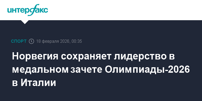 Москва. 18 февраля. INTERFAX.RU - Сборная Норвегии продолжает возглавлять неофициальный командный зачет зимних Олимпийских игр 2026 года в Италии по итогам очередного соревновательного дня.
