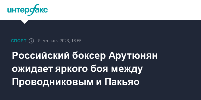 Москва. 18 февраля. INTERFAX.RU - Временный чемпион мира WBA в бриджервейте, боксер RCC Boxing Promotions Вартан Арутюнян воодушевлен информацией о проведении выставочный боя россиянина Руслана Проводникова и филиппинца Мэнни Пакьяо: