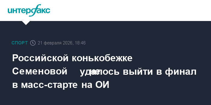 Москва. 21 февраля. INTERFAX.RU - Россиянка Анастасия Семенова выбыла из борьбы за медали зимней Олимпиады в Италии в соревнованиях по конькобежному спорту в масс-старте.