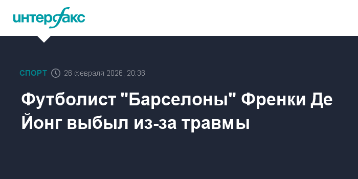 Москва. 26 февраля. INTERFAX.RU - Полузащитник "Барселоны" Френки Де Йонг пропустит несколько недель из-за травмы, сообщается на сайте испанского футбольного клуба.