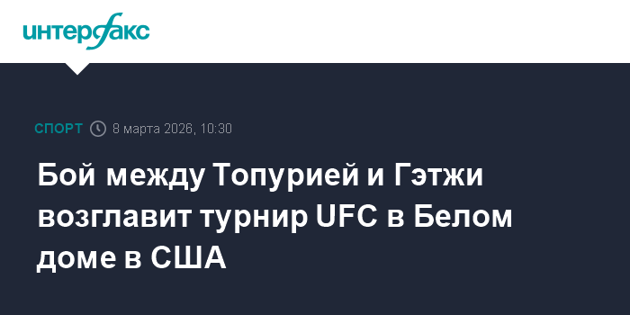 Москва. 8 марта. INTERFAX.RU - Поединок между чемпионом испанцем грузинского происхождения Илией Топурией и американцем Джастином Гэтжи возглавит кард турнира UFC, который пройдет 14 июня в Белом доме в США. Об этом сообщает пресс-служба UFC.