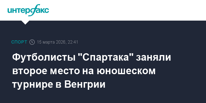 Москва. 15 марта. INTERFAX.RU - Юношеская команда московского "Спартака" заняла второе место на международном товарищеском турнире в Венгрии, организованном при участии Министерства спорта России и Министерства иностранных дел Венгрии.