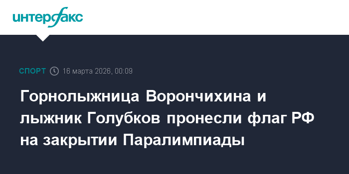 Москва. 16 марта. INTERFAX.RU - Горнолыжница Варвара Ворончихина и лыжник Иван Голубков пронесли флаг Российской Федерации на церемонии закрытия зимних Паралимпийских игр в Италии.