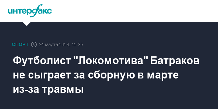 Москва. 24 марта. INTERFAX.RU - Полузащитник "Локомотива" Алексей Батраков пропустит матчи сборной России против Никарагуа и Мали, запланированные на конец марта. Об этом сообщает пресс-служба московского футбольного клуба.