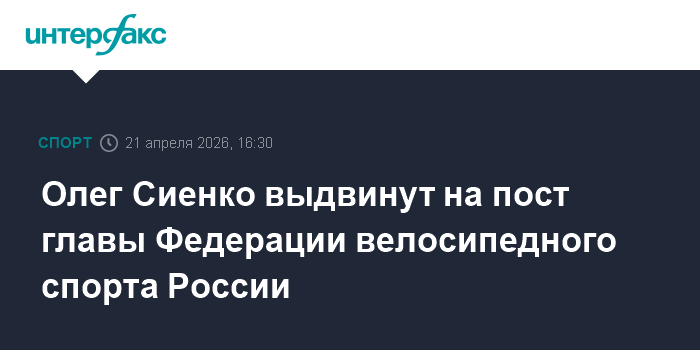 Москва. 21 апреля. INTERFAX.RU - Промышленник и предприниматель Олег Сиенко выдвинут на пост президента Федерации велосипедного спорта России, сообщил министр спорта и глава ОКР Михаил Дегтярев.