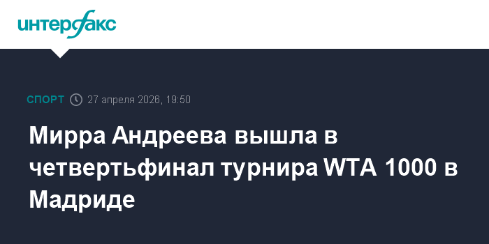 Москва. 27 апреля. INTERFAX.RU - Российская теннисистка Мирра Андреева победила представительницу Венгрии Анну Бондарь в четвертом круге турнира категории WTA 1000 в Мадриде.