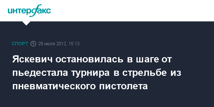 Москва. 29 июля. СПОРТ-ЭКСПРЕСС/INTERFAX.RU - Российская спортсменка Любовь Яскевич в финале олимпийского турнира в стрельбе из пневматического пистолета на дистанции 10 метров показала четвертый результат. В квалификационных соревнованиях в воскресенье отечественная спортсменка показала 8-й результат - 385 очков. В итоге у нее стало 486 очков.