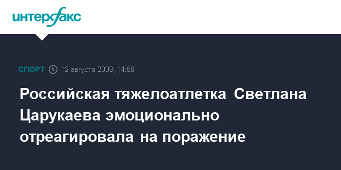 Москва. 12 августа. INTERFAX.RU - Российская тяжелоатлетка Светлана Царукаева на Играх в Пекине не смогла в трех попытках в рывке взять самый большой вес (107 кг) среди участниц соревнований в весовой категории до 63 кг и выбыла из борьбы за медали, сообщает AFP.