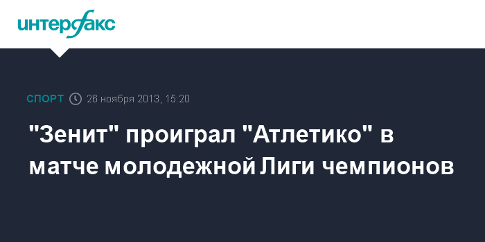Санкт-Петербург. 26 ноября. INTERFAX.RU - Молодежный состав петербургского "Зенита" на своем поле проиграл мадридскому "Атлетико" в матче 5-го тура группового этапа Лиги чемпионов среди игроков до 19 лет.