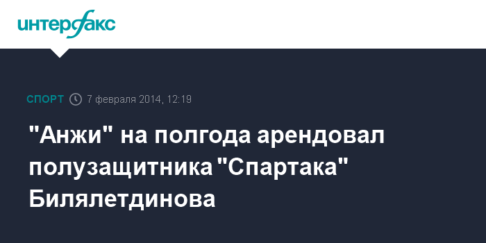 Москва. 7 февраля. INTERFAX.RU - Полузащитник московского "Спартака" Динияр Билялетдинов на правах аренды переходит в махачкалинский "Анжи", сообщает официальный Twitter дагестанской команды.