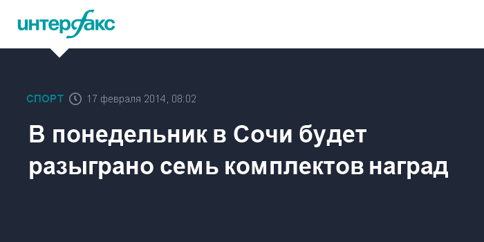 Москва. 17 февраля. INTERFAX.RU - На зимних Олимпийских играх в Сочи в понедельник будет разыграно семь комплектов наград.