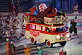20:14 - Церемония началась. На стадион "Фишт" выезжает лодка, в которой сидит знакомая нам по церемонии открытия девочка Люба. Рядом с ней ее новые друзья Валентина и Юра, а также несколько клоунов.