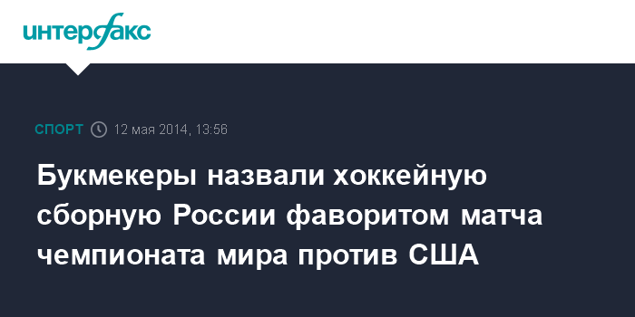 Москва. 12 мая. INTERFAX.RU - Сборная России по хоккею является фаворитом матча чемпионата мира против США, согласно котировкам британской букмекерской конторы William Hill.
