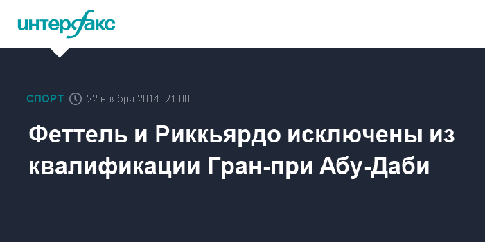 Москва. 22 ноября. INTERFAX.RU - Пилоты Red Bull немец Себастьян Феттель и австралиец Даниэль Риккьярдо исключены из протокола квалификации заключительного этапа чемпионата мира "Формулы-1" Гран-при Абу-Даби, сообщает BBC.