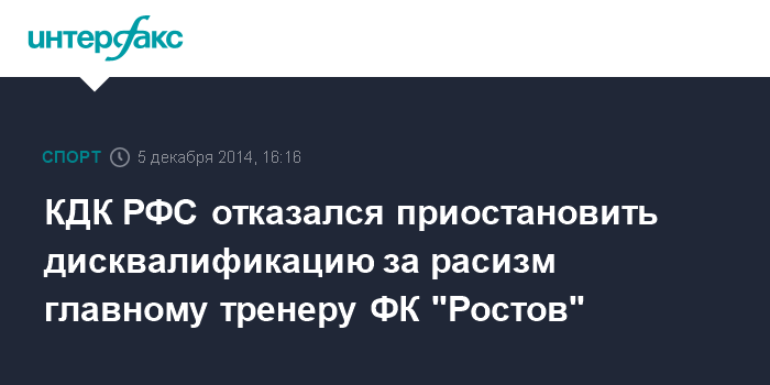КДК РФС отказался приостановить дисквалификацию за расизм главному тренеру ФК "Ростов"