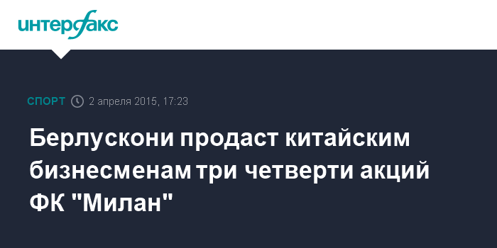 Москва. 2 апреля. INTERFAX.RU - Президент итальянского ФК "Милан" Сильвио Берлускони заявил о намерении продать 75 процентов акций клуба объединению предпринимателей из Китая.