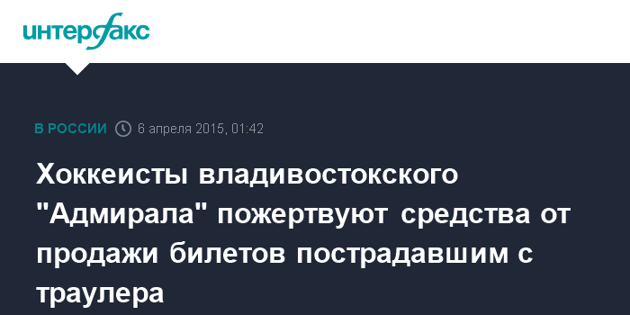 Москва. 6 апреля. INTERFAX.RU - Хоккеисты владивостокского клуба КХЛ "Адмирал" окажут поддержку пострадавшим и семьям погибших в результате крушения траулера "Дальний Восток" в Охотском море.