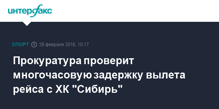 Москва. 29 февраля. INTERFAX.RU - Дальневосточная транспортная прокуратура организовала проверку по факту задержки вылета из аэропорта Владивостока самолета, на котором в Новосибирск в воскресенье возвращались хоккеисты "Сибири".