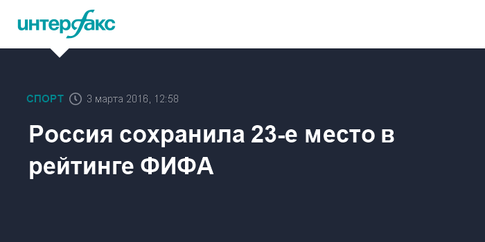 Москва. 3 марта. INTERFAX.RU - Сборная России осталась на 23-месте в февральском Международной федерации футбольных ассоциаций (ФИФА), обновленную версию которого опубликовала пресс-служба организации в четверг.