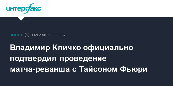 Москва. 9 апреля. INTERFAX.RU - Украинский боксер, экс-чемпион мира Владимир Кличко проведет матч-реванш против чемпиона мира по боксу в супертяжелом весе по версиям WBA, WBO и IBO Тайсона Фьюри 9 июля.