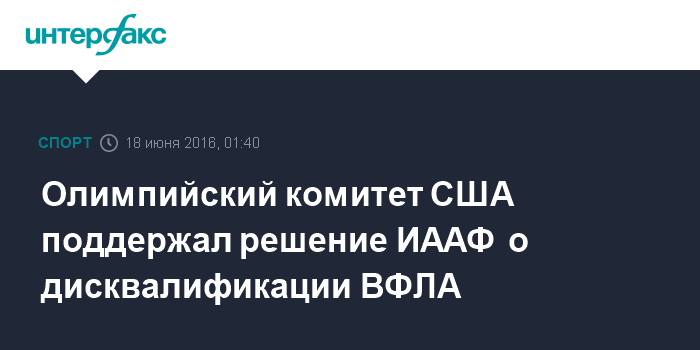 Москва. 18 июня. INTERFAX.RU - Олимпийский комитет США всецело поддержал решение Совета Международной ассоциации легкоатлетических федераций (IAAF) оставить в силе дисквалификацию Всероссийской федерации легкой атлетики (ВФЛА).
