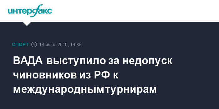 Москва. 18 июля. INTERFAX.RU - Всемирное антидопинговое агентство призвало международные спортивные инстанции отказать российским чиновникам в доступе на международные соревнования, включая летнюю Олимпиаду в Рио-де-Жанейро.